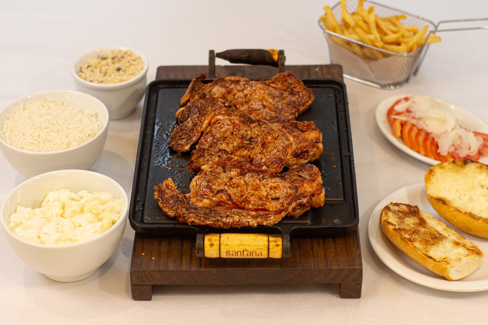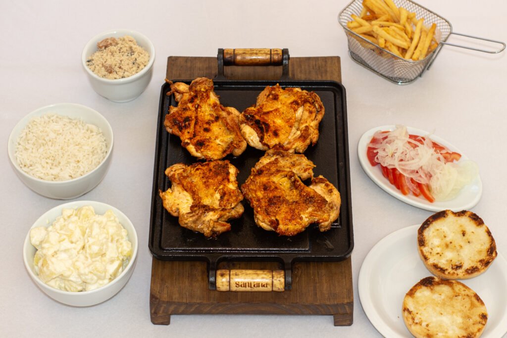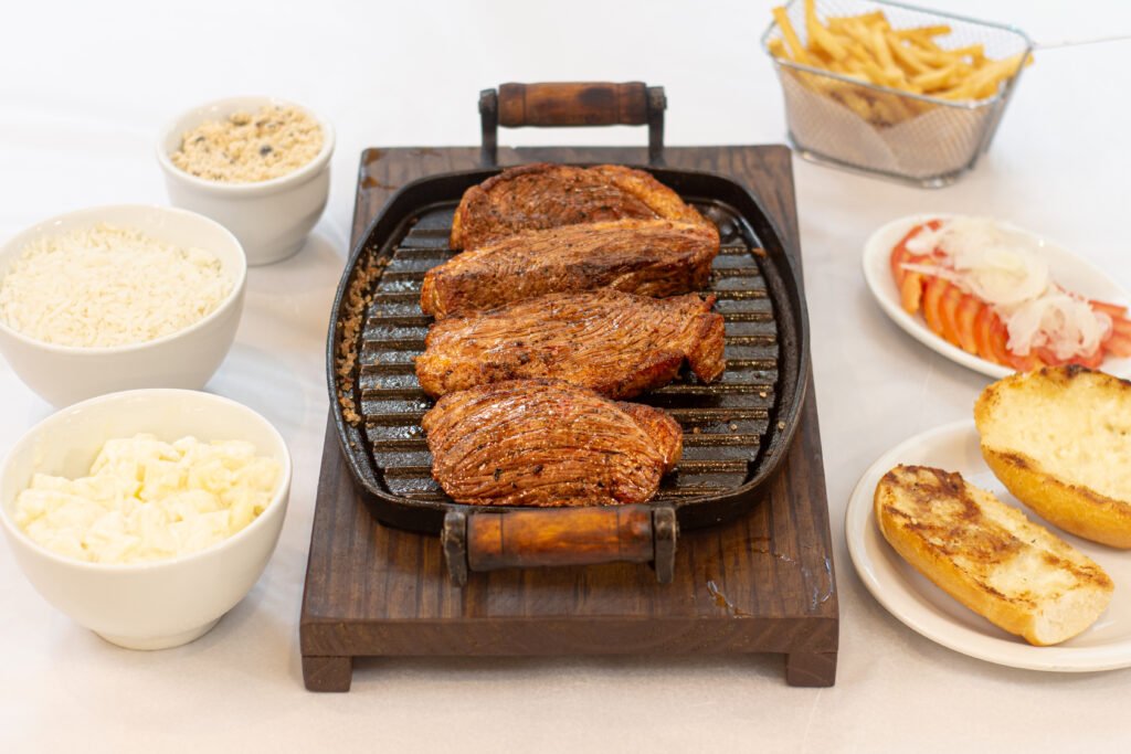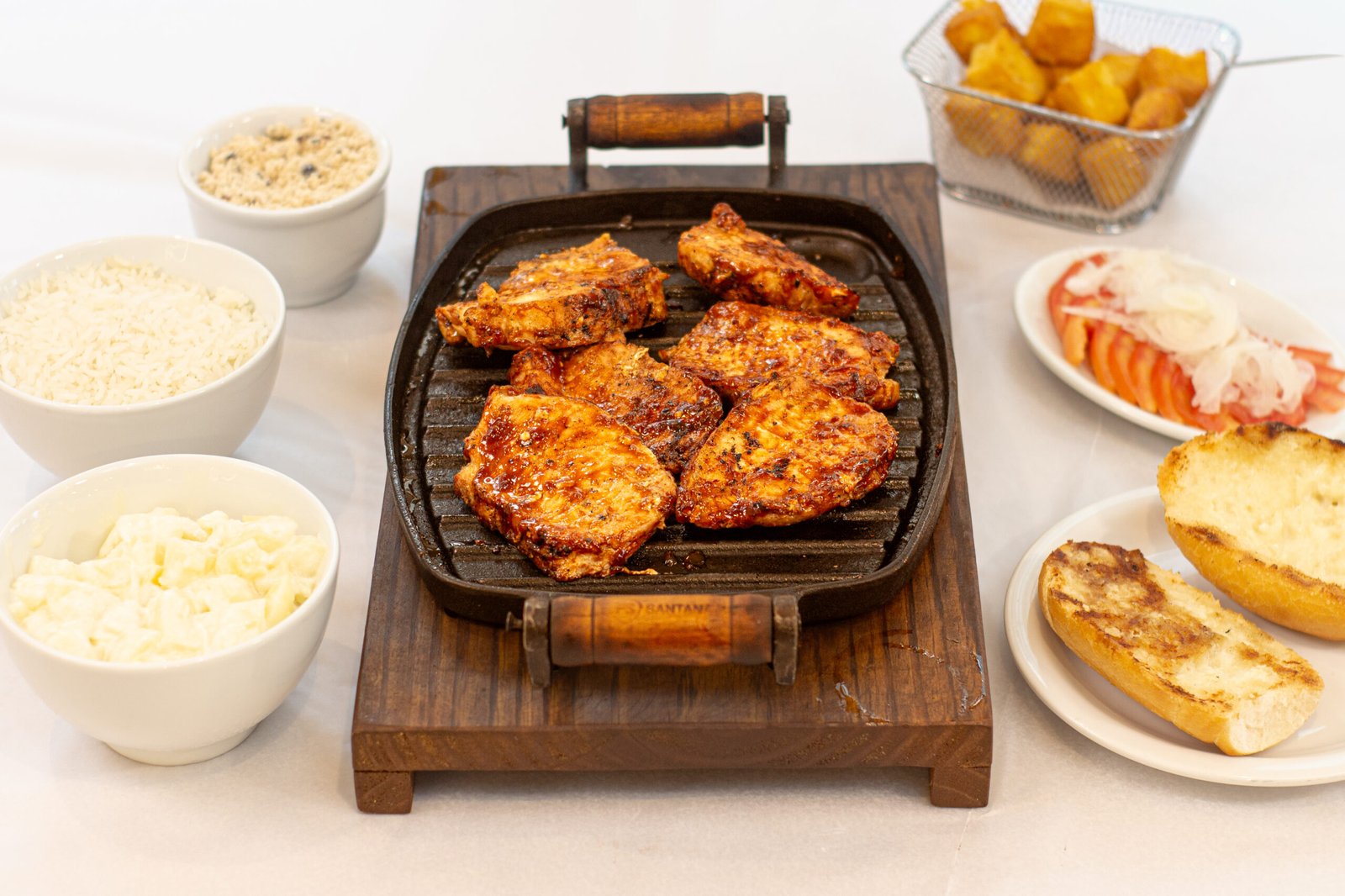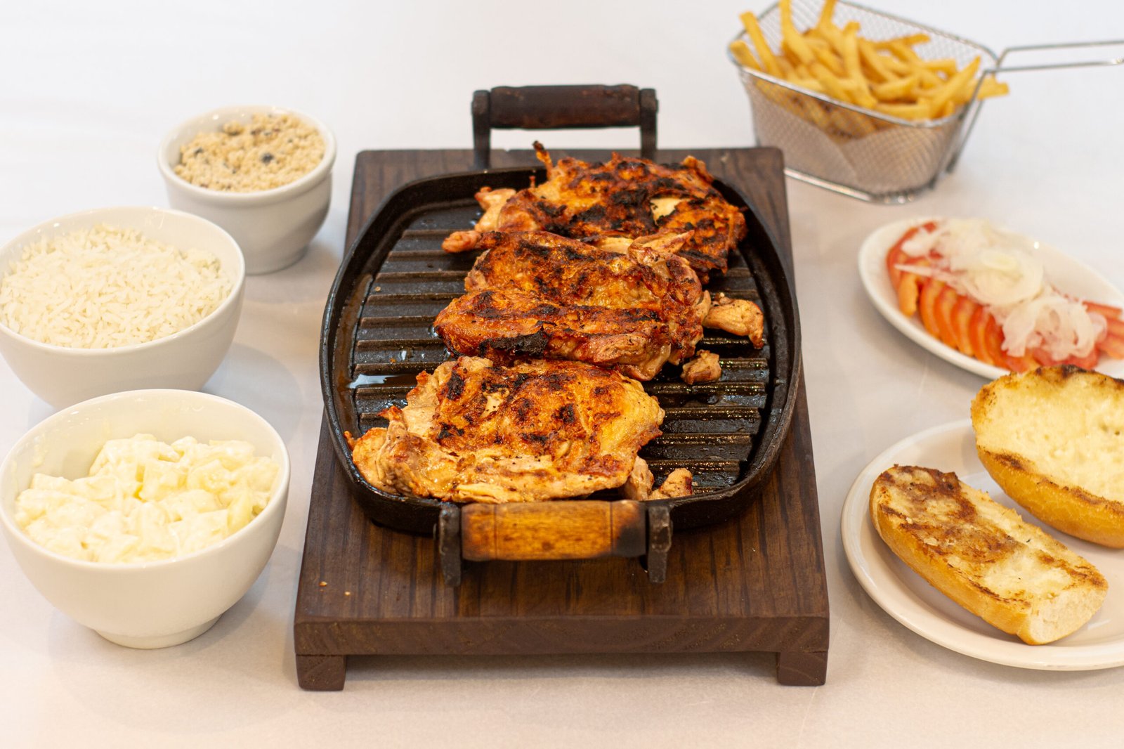 Acompanhamentos: Arroz, maionese, fritas, pão com alho, farofa e salada.