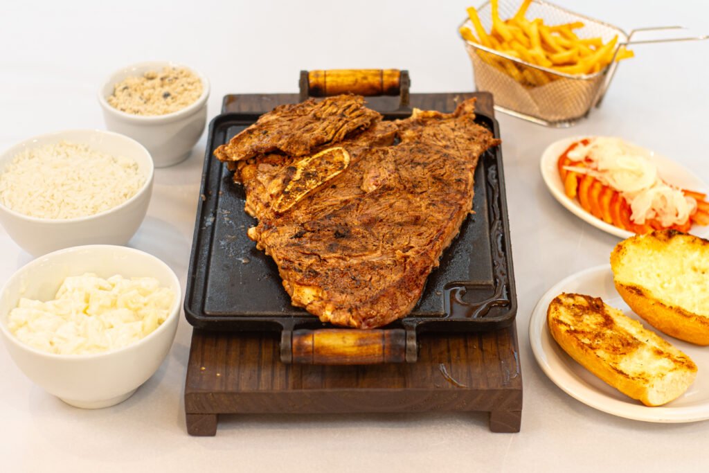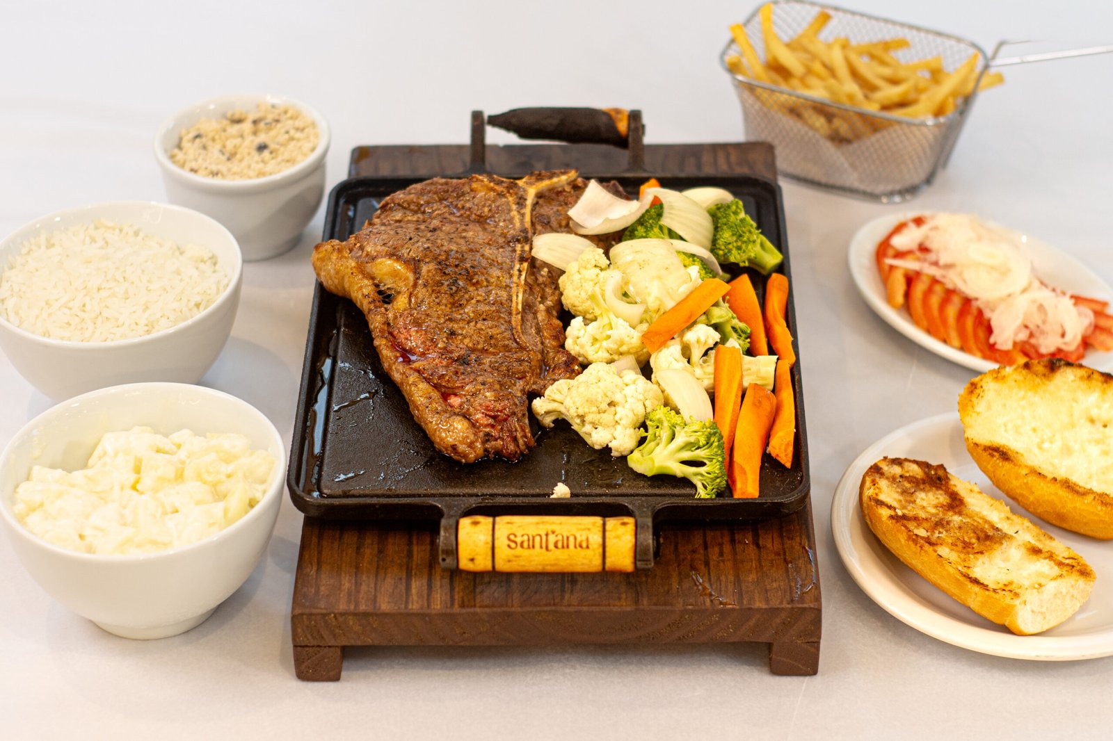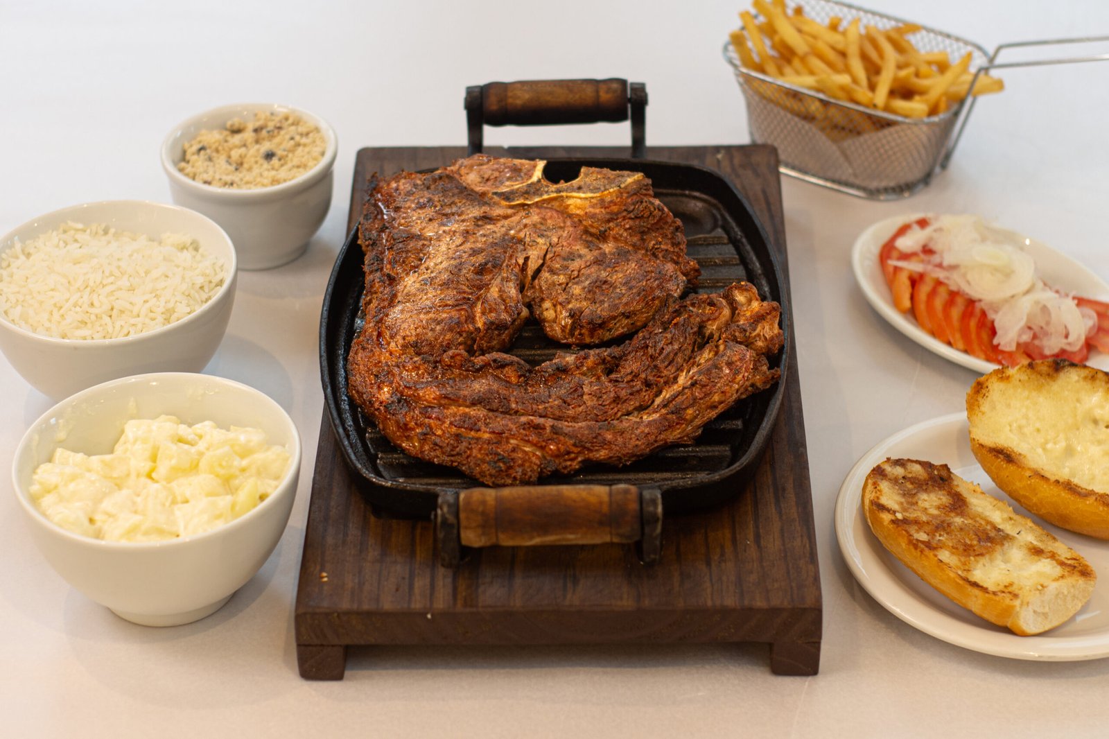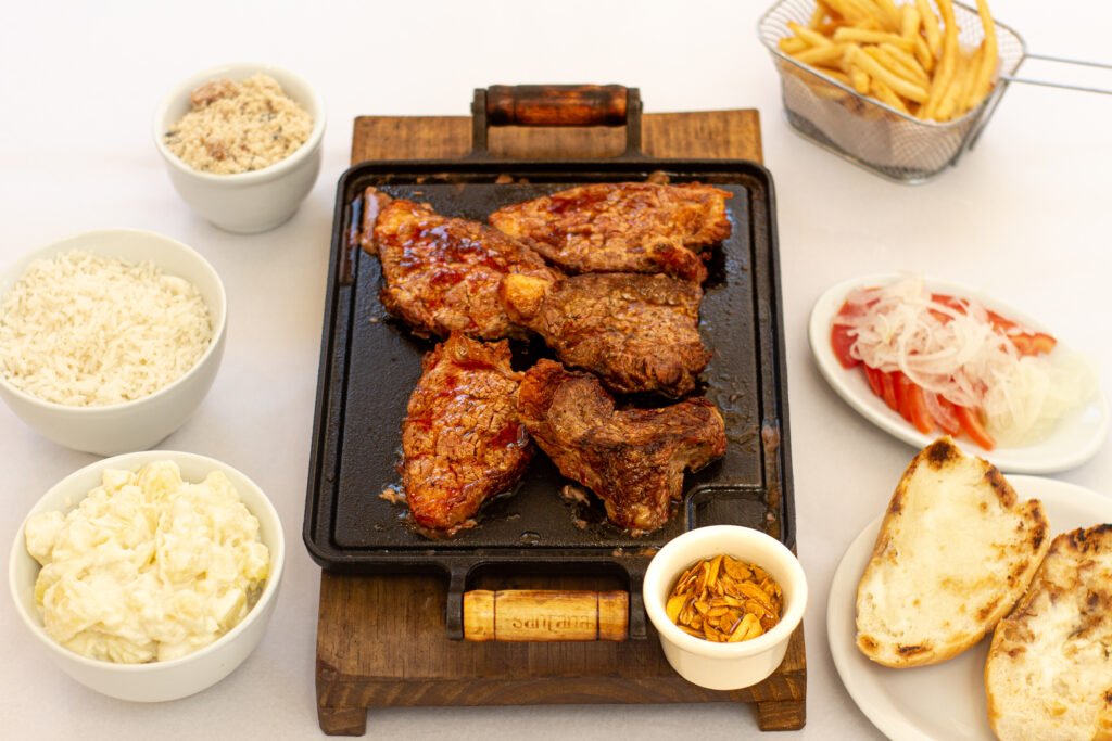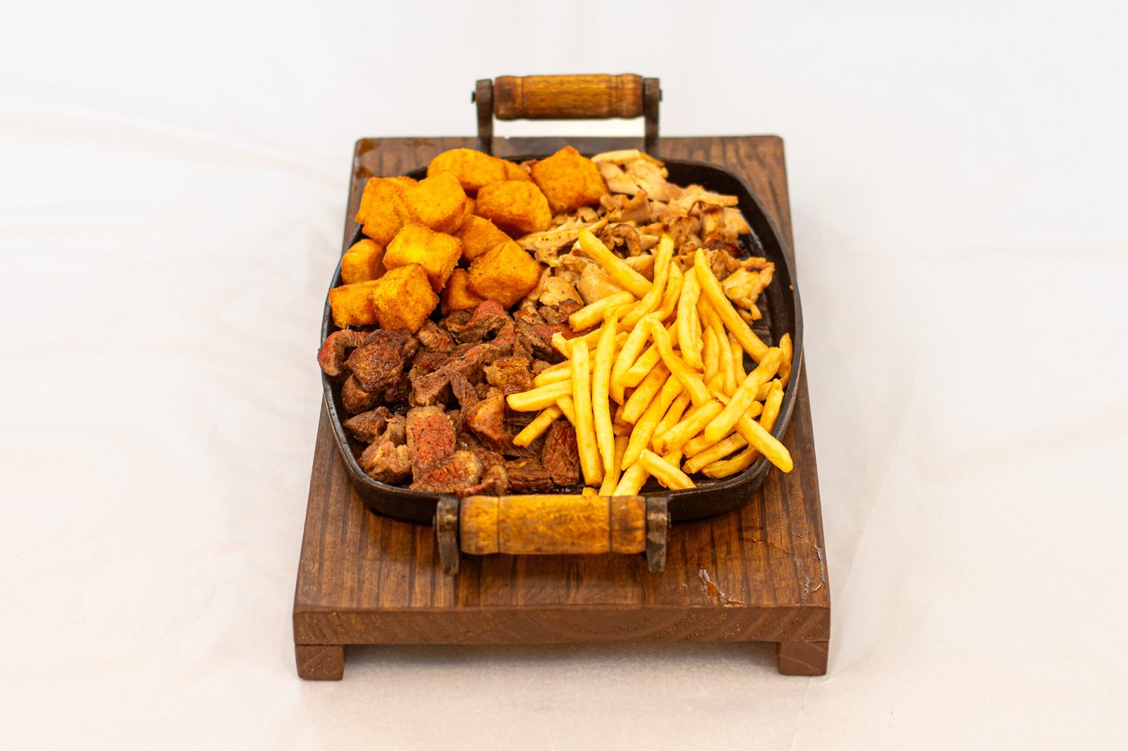 Acompanhamentos: Arroz, maionese, fritas, pão com alho, farofa e salada.